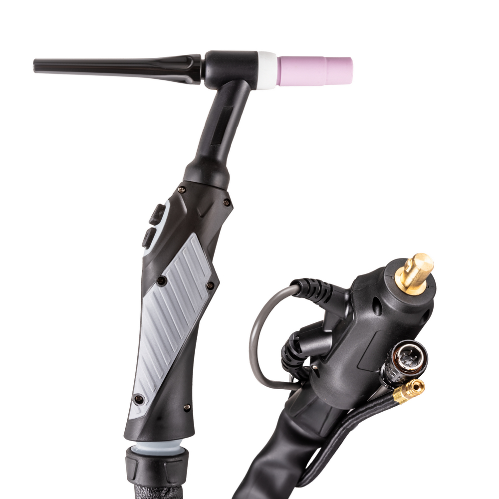 С помощью двух дополнительных кнопок UP/DOWN на рукоятке можно регулировать сварочный ток в большую или меньшую сторону на самой горелке во время процесса сварки. Это сильно увеличивает производительность, т.к. нет необходимости каждый раз выставлять нужное значение сварочного тока на панели управления сварочного аппарата.