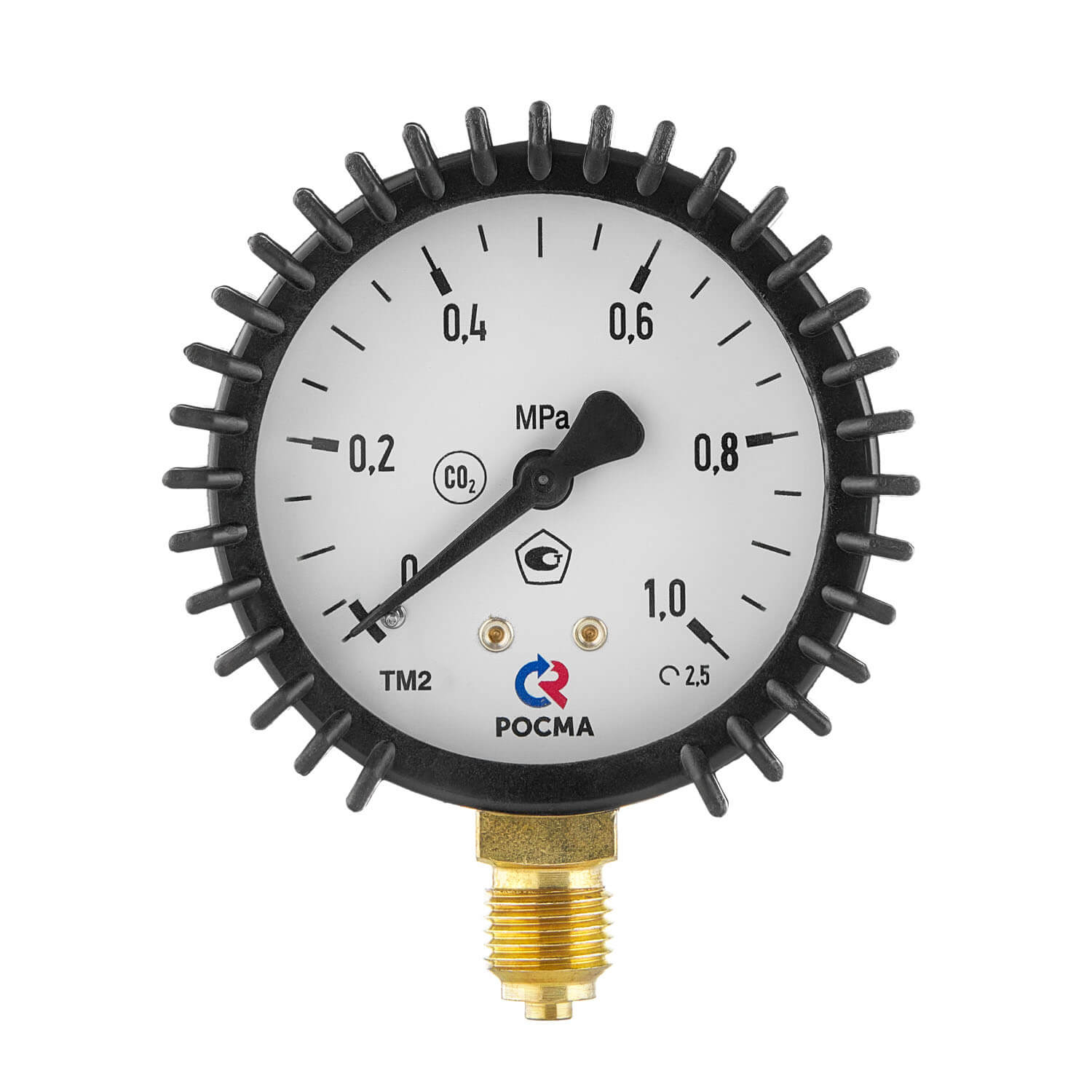 Сварочный манометр для измерений показаний давления углекислого газа от 0 до 1.0 МПа. Класс точности манометра – 2.5. Корпус манометра выполнен из стали, а механизм из латуни. Прибор имеет радиальное присоединение.